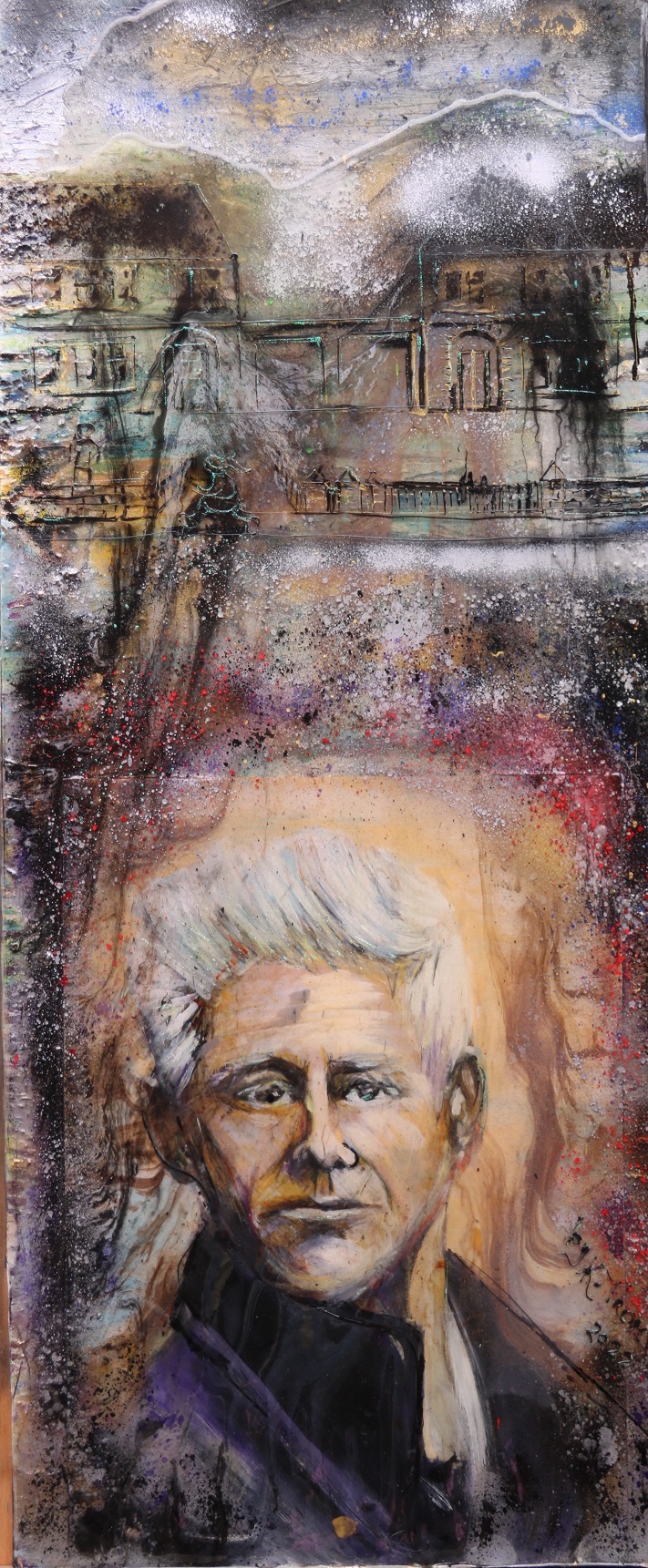 Portrait of Adam Clayton, guitarist in U2, in a mixed media, spray paint and resin layer to create a 3D effect on canvas.