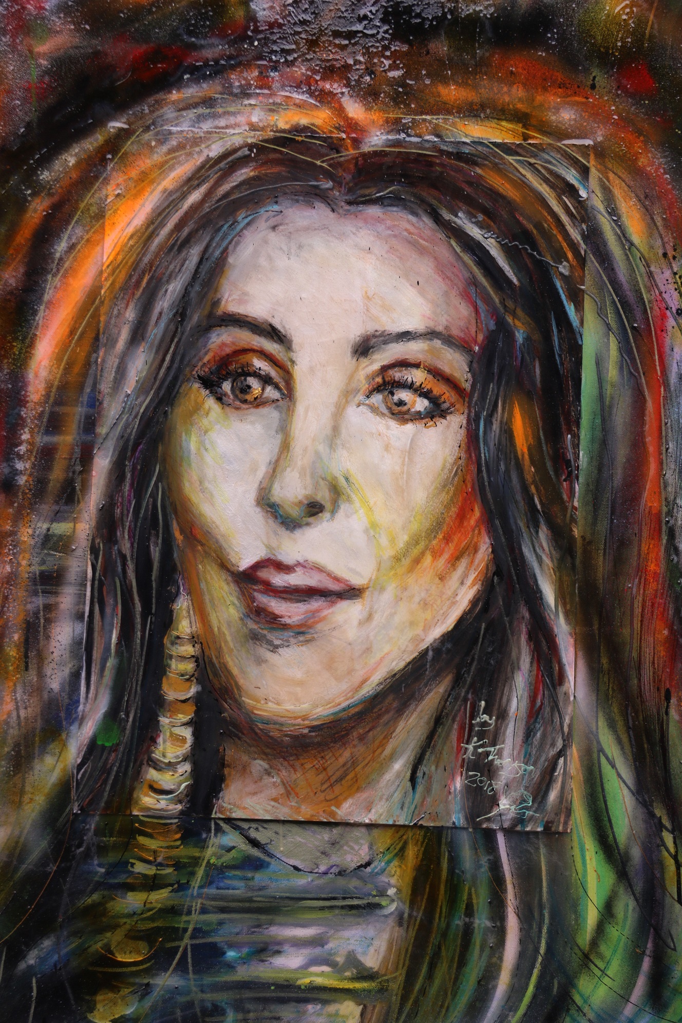 Mixed media portrait of Cher with spray paint on paper and canvas with resin. Dimensions 101cm x 76cm. Original Art Work £1250.00
