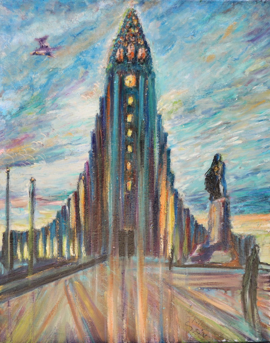 Oil on canvas shows the dawn shining on Reykjavic Cathedral Tower, with the statue of Leifur Eiriksson in the foreground.