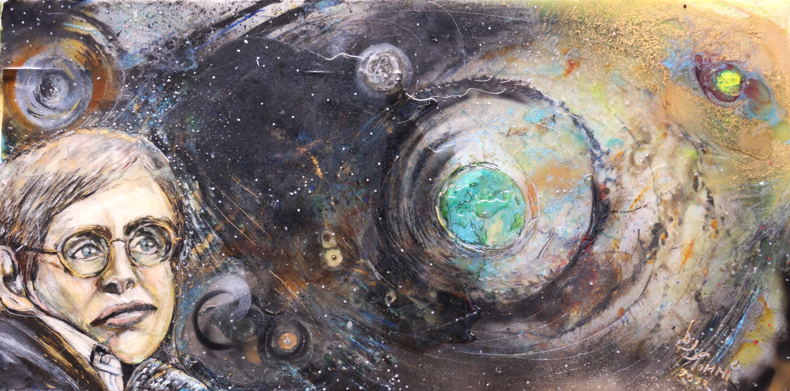 A portrait of Professor Stephen Hawkings using mixed media on aluminium with resin layers to provide a 3d effect. Orginal 101cm X 50cm