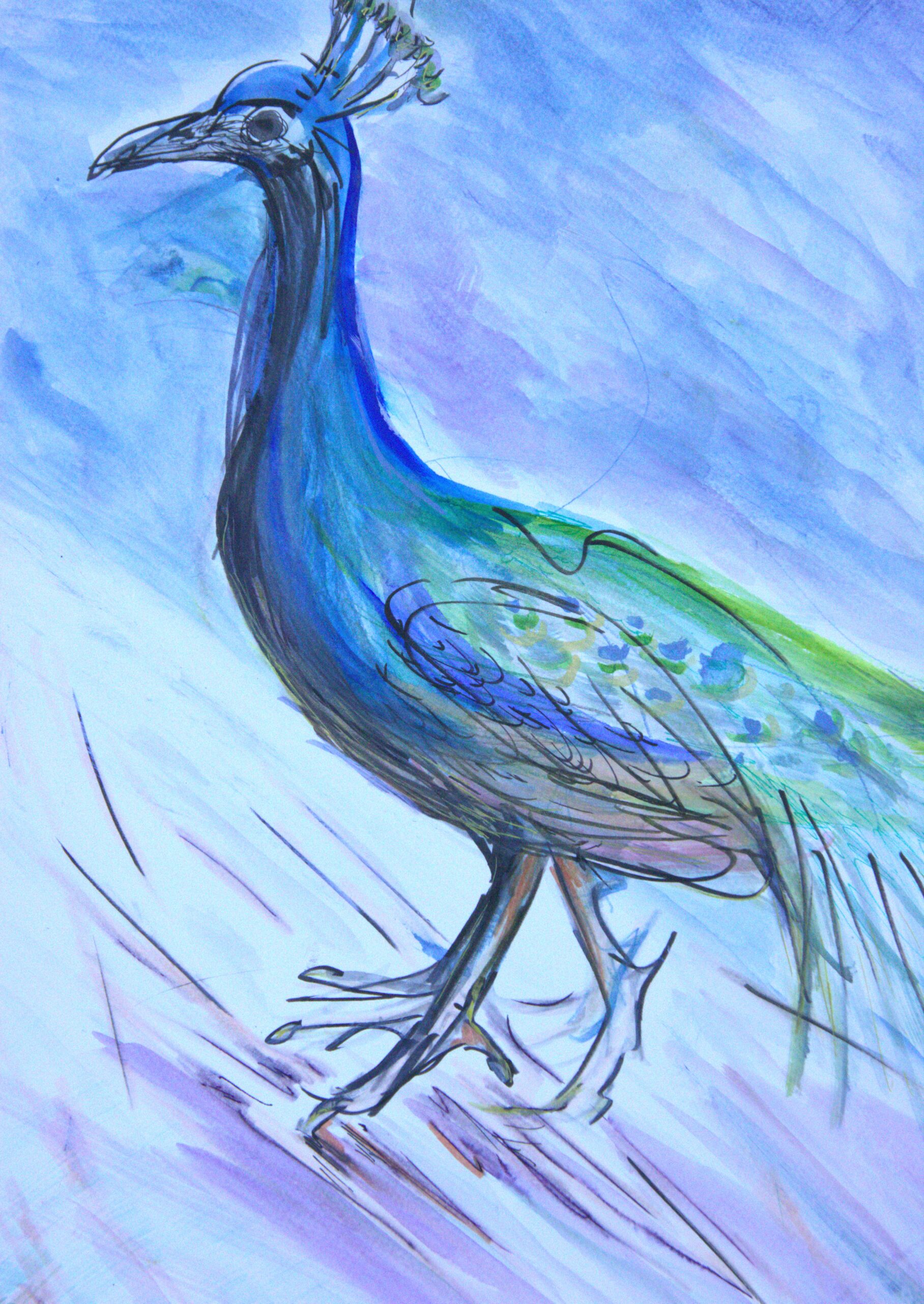 Peacock pacing as it rushes about its business.