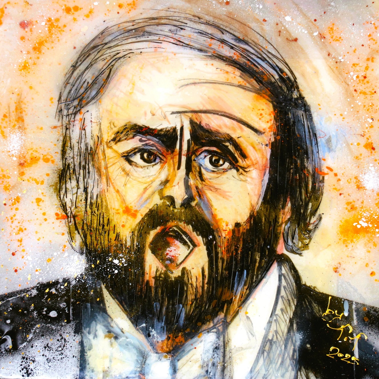 Portrait of Opera singer Pavarotti with mixed media, spray paint and resin to provide a 3d effect. Original 50cm X 50cm.